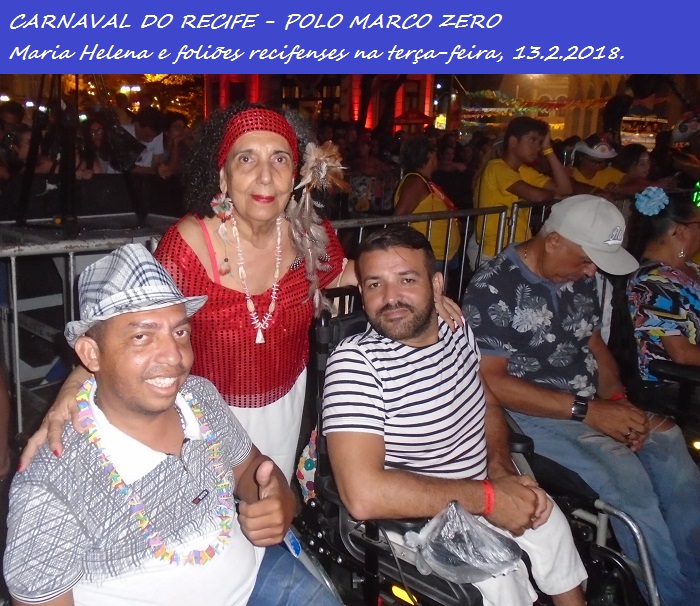 Imagens de fotos da blogueira jornalista Maria Helena do Nascimento, a Cidadã repórter que faz e participa da notícia, no último dia do Carnaval do Recife, Ano 2018, no Marco Zero, com o prefeito da capital pernambucana Geraldo Júlio de Melo; a cantora paraibana Elba Ramalho; o internacional Alceu Valença; o homenageado do Carnaval do Recife 2018, J. Michiles; o grande Maestro Forró; o presidente da Fundação de Cultura da PCR, Diego Rocha; os cadeirantes; o gari Marcos. representando toda a classe; os jovens integrantes da Imprensa, em clima de alto astral;